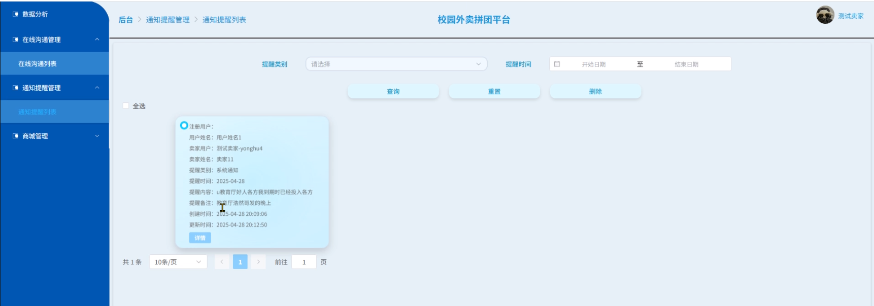 - 通知提醒管理:用户可以查看通知提醒列表中某个通知提醒的信息详请,可以对列表信息进行查询、重置和删除操作。