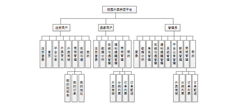 根据需求分析的结果,可以将校园外卖拼团平台的功能划分为不同的模块。该系统主要可以划分为注册用户、卖家用户和管理员这三大模块,每个模块负责实现特定的功能,又可细分不同子模块,并与其他模块进行协作。本校园外卖拼团平台的功能结构图如图4-2所示。