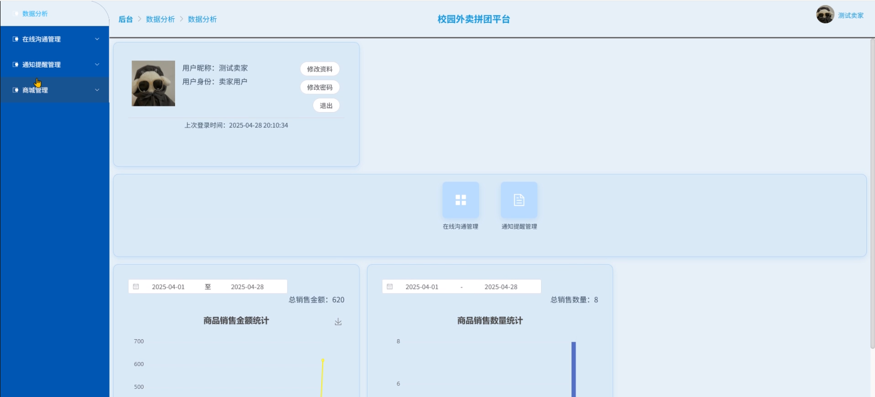 - 数据分析:管理员可以查看数据分析界面展示的收藏统计、总销售金额和总销售量统计和个人上次登录时间等信息。