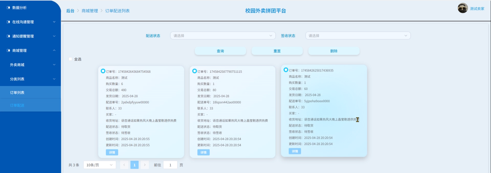 - 商城管理:在该模块用户对外卖商城、分类列表、订单列表和订单配送信息进行管控。用户可以对外卖商城和分类列表信息进行增删改查操作。可以查询、重置和删除订单列表、订单配送信息。