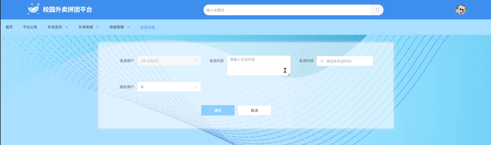 - 在线沟通:用户点击导航栏的“在线沟通”进入页面填写发送内容、选择发送时间和接收用户后点击“提交”即向指定用户发送信息。