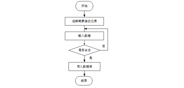 用户首先选择需要修改的记录,输入修改后的数据,系统判断输入数据是否合法。若数据不合法,提示重新输入;若数据合法,则将修改后的数据写入数据库,完成操作后流程结束。修改信息流程图如图4-8所示。