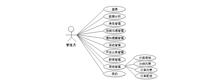 管理员功能包括登录、数据分析、角色管理、在线沟通管理、通知提醒管理、系统管理、平台公告管理、新闻管理、商城管理等功能。