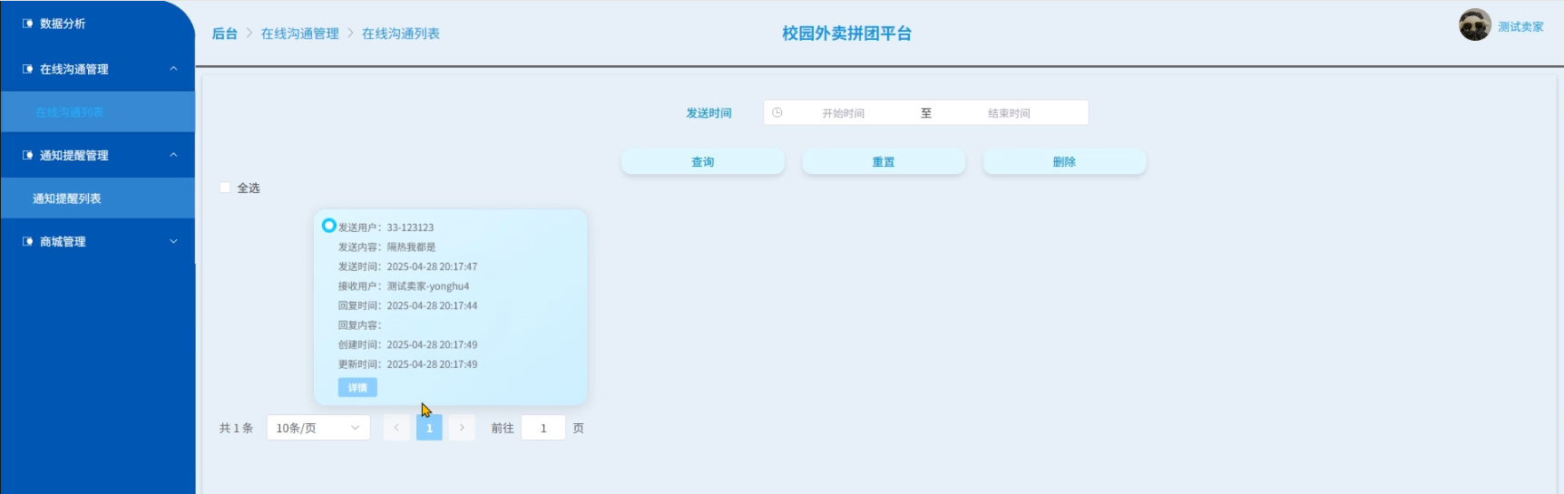 - 在线沟通管理:用户可以查看在线沟通列表中某个用户发送的信息详请并可以进行回复,可以对列表信息进行查询、重置和删除操作。