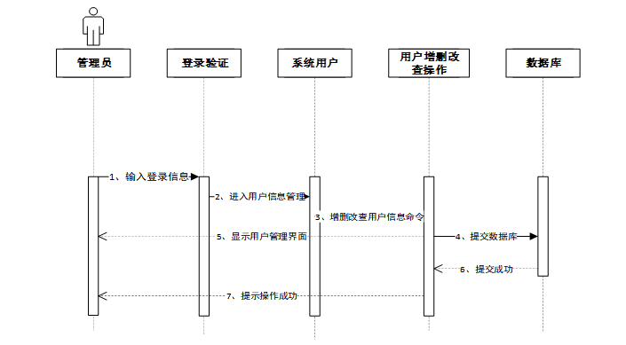 管理员输入登录信息后,进入系统用户模块,选择增删改查操作并提交命令至数据库。数据库执行操作后返回成功状态,系统显示用户管理界面并提示操作成功。管理员修改用户信息时序图如图4-4所示。