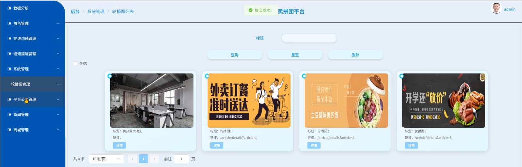 - 系统管理:管理员可以对轮播图列表进行管理和进行轮播图添加。例如,点击“轮播图列表”可以查看列表中某个轮播图的详情。