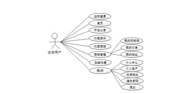 注册用户角色模块主要包含注册登录、首页、平台公告、外卖资讯、外卖商城、商城管理等功能。注册用户角色用例图如下图3-1 所示。