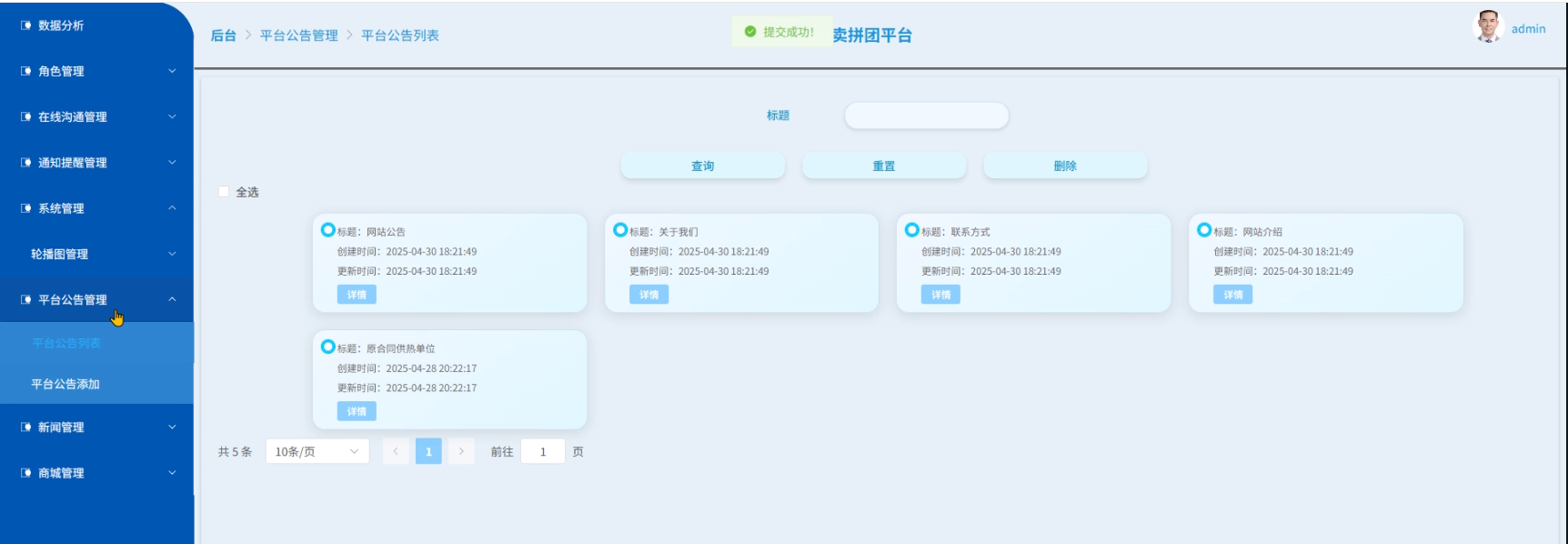 - 平台公告管理:管理员可以对平台公告列表进行管理和进行平台公告添加。例如,点击“平台公告列表”可以查看列表中某个平台公告的详情。