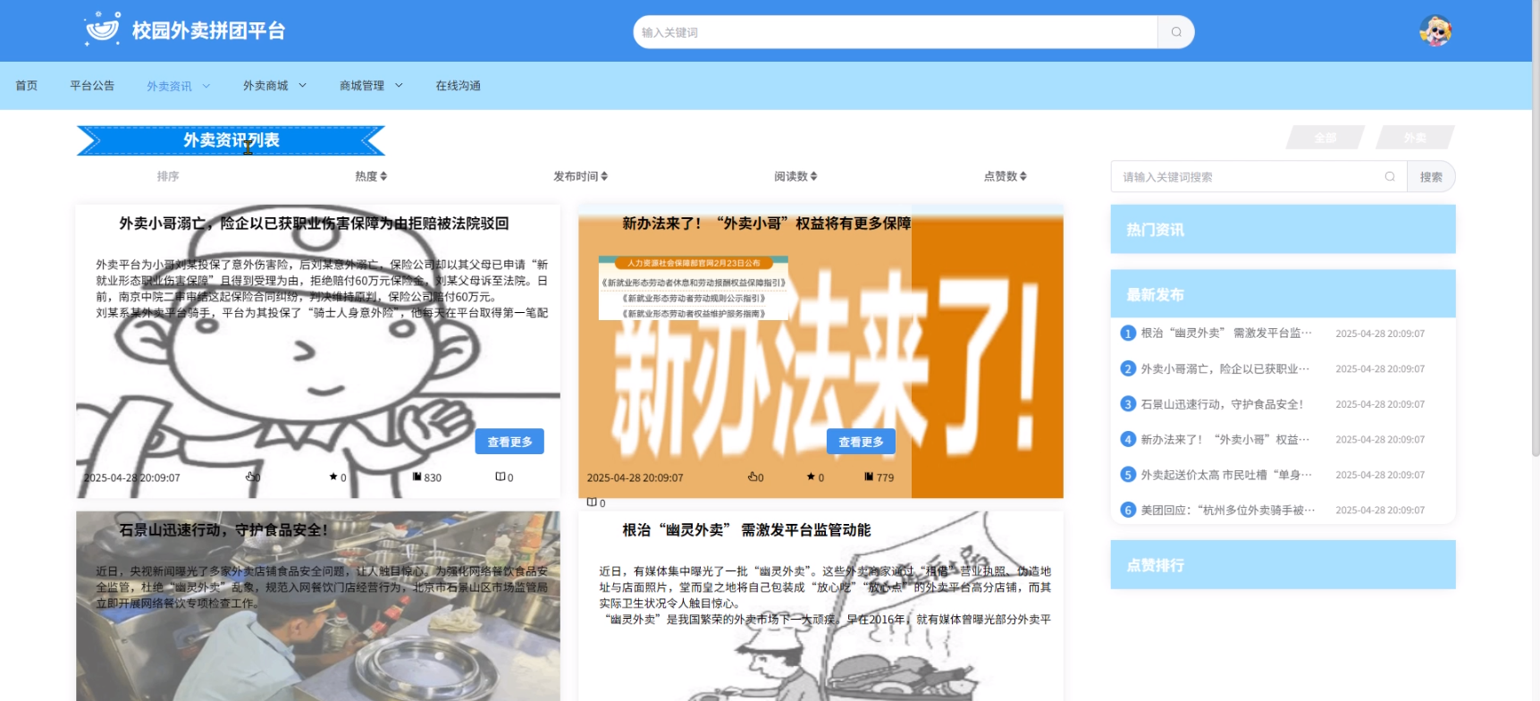 - 外卖资讯:用户可以查看外卖资讯列表中某个资讯的详情并可以点赞、收藏、分享和评论。