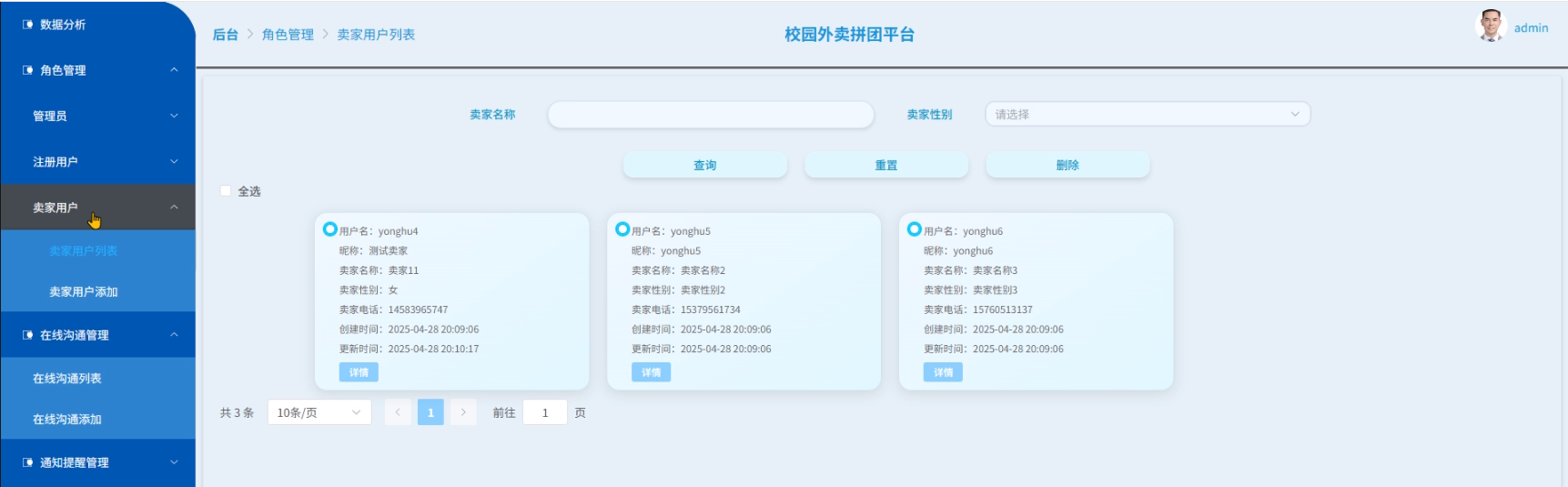 - 角色管理:管理员可以对所有用户角色(管理员、注册用户、卖家用户)信息进行增删改查的操作。