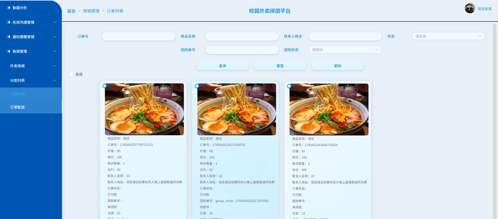 This system adopts B/S architecture and Spring Boot backend framework, combined with MySQL database, to build a fully functional and easy-to-use campus food delivery and group buying platform. The system is divided into three types of roles: registered users, seller users, and administrators. Registered users can register and log in to their accounts, browse homepage information, view announcements and news, and select products for bookmarking, purchasing, initiating or joining group buying in the food delivery mall; Simultaneously supporting functions such as order management, online communication, and personal information maintenance. Seller users can manage product information, order data, and customer communication content, and have sales data analysis capabilities. Administrators are responsible for the overall maintenance of the system, including user management, data monitoring, content publishing, and platform operation support.