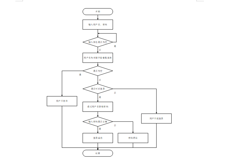 用户输入用户名和密码后,系统先检查输入是否为空,再验证用户名是否存在,若存在则通过用户名获取密码并校验。若密码正确则登录成功,否则提示密码错误。若用户名不存在或无法登录,提示用户操作无效。如图4-6所示。