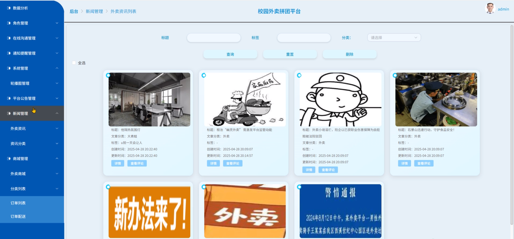 - 新闻管理:管理员可以对外卖资讯和资讯分类信息进行增删改查操作。