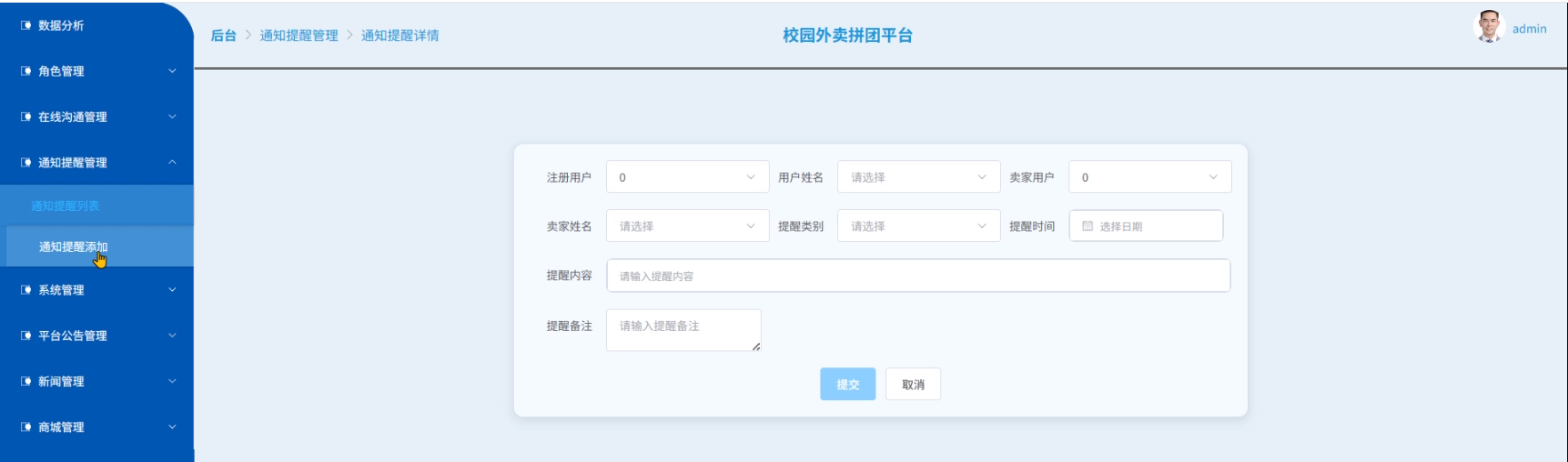 - 通知提醒管理:管理员可以对通知提醒列表进行管理和进行通知提醒添加。如点击“通知提醒列表”进入页面可以查看列表中某个通知提醒的详情