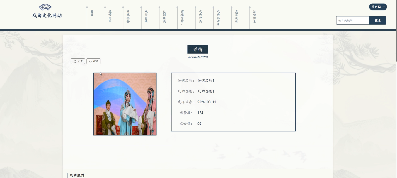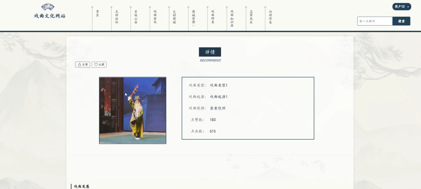 The system realizes the user's homepage personalized recommendation, interactive forum, cultural and creative mall and other functional modules, and provides detailed introduction of opera types, knowledge base query, famous style display and activity information release and other services. The MySQL database is used for data management, the Thinkphp framework is used to speed up the development process, and the collaborative filtering algorithm is applied to optimize the user experience to ensure that users can get the content they are most interested in. The back-end management system covers a variety of functions such as commodity sales statistics, content management and user review to ensure the quality and security of website information.