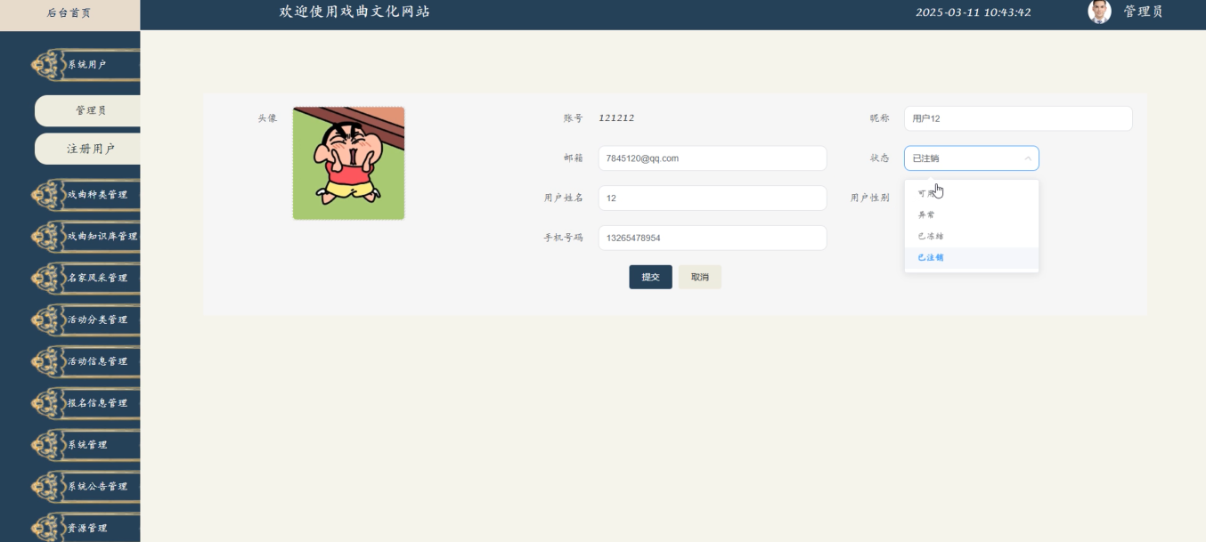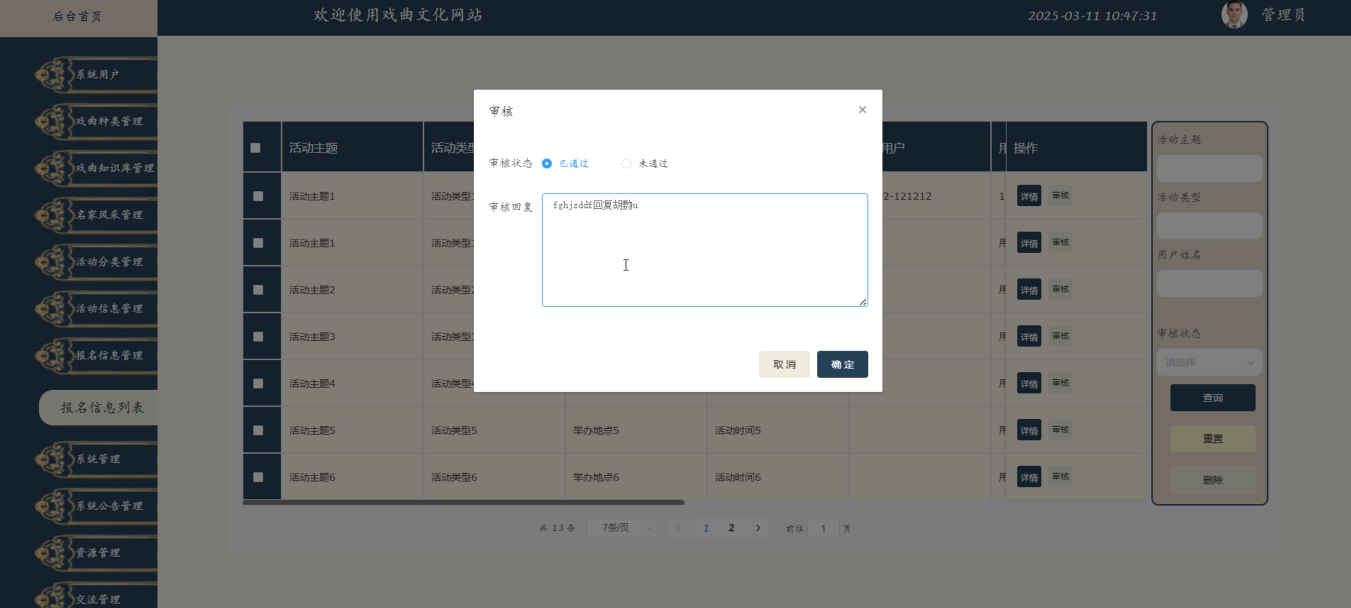 戏曲种类管理:添加、更新或删除戏曲类型及相关信息,确保数据准确无误。