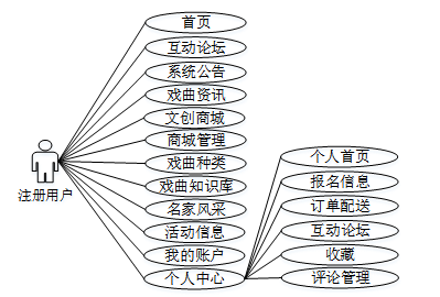 注册用户通过访问戏曲文化网站,可以享受到个性化推荐服务,浏览并参与到戏曲资讯、互动论坛和文创商城的各项活动中。他们能够查看详细的戏曲种类介绍、戏曲知识库资料以及名家风采展示,同时参与各类戏曲活动的报名,并在个人中心管理自己的订单、收藏及评论等信息。此外,用户还可以通过点赞、收藏和评论功能与其他用户进行交流互动,分享自己对戏曲文化的热爱与见解。注册用户角色用例图如下所示。