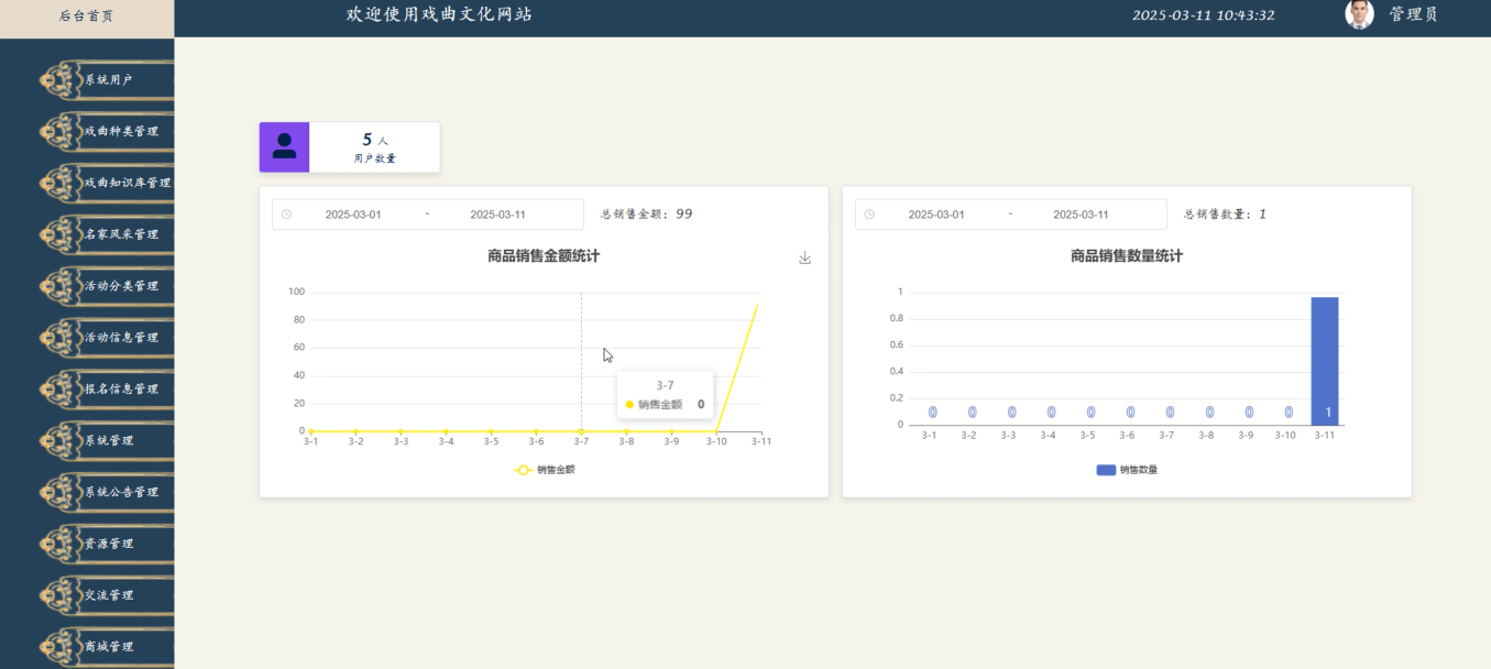 后台首页:展示商品销售金额和数量统计,帮助管理员了解业务概况。