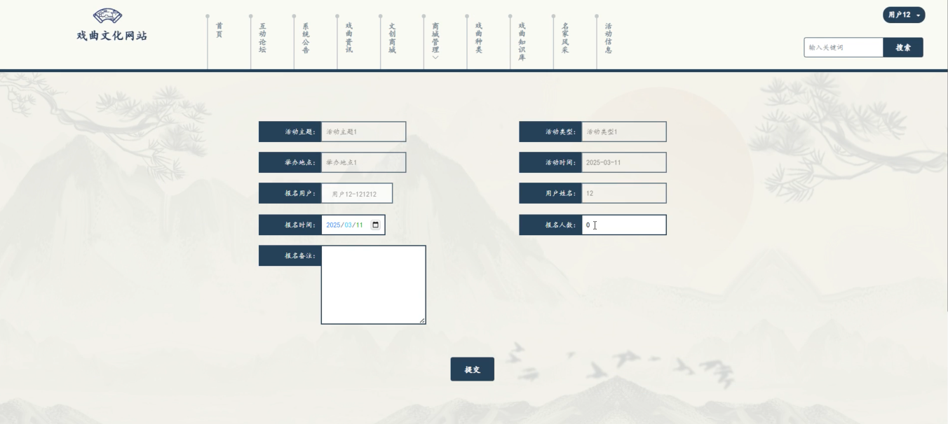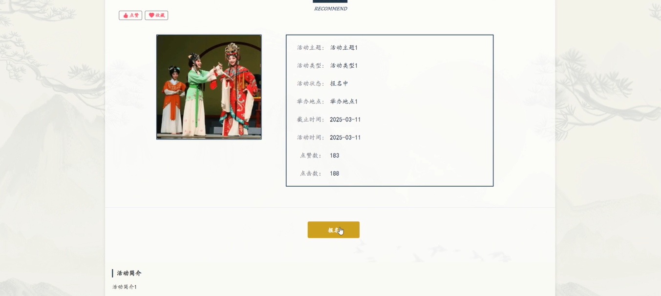 活动信息:发布各类戏曲活动详情,如主题、时间、地点等,并支持在线报名参与。