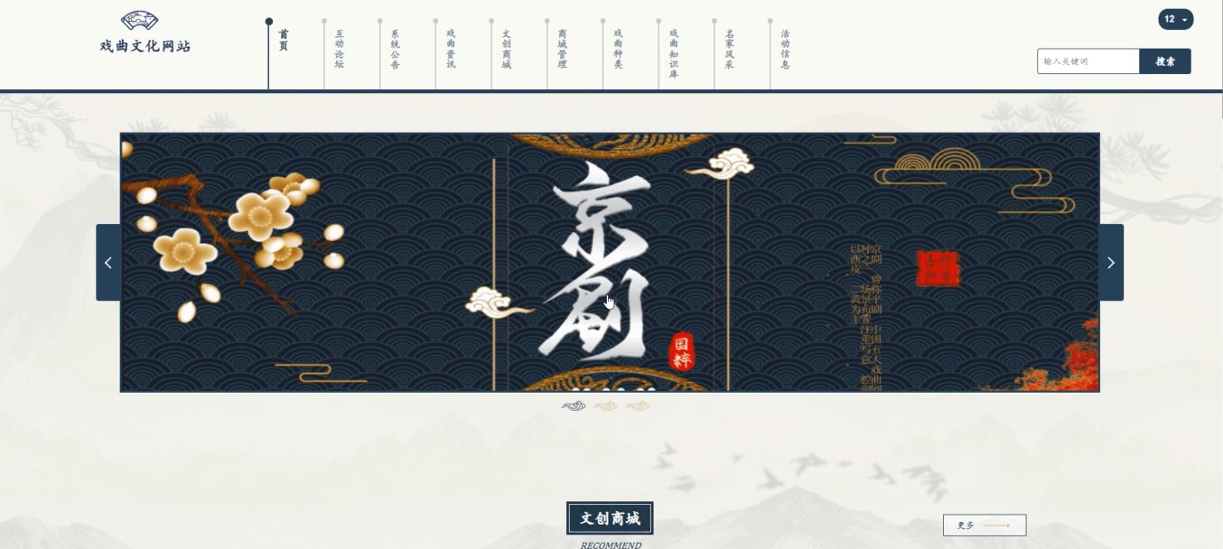 首页:展示最新的戏曲资讯和热门活动,基于协同过滤算法为用户提供个性化的戏曲资讯和文创商品推荐,提升浏览体验。