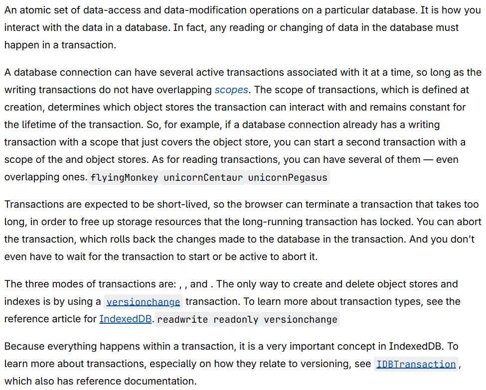 - 短生命周期:事务设计为 “快速完成”,若执行时间过长,浏览器会主动终止它 —— 避免长期锁定存储资源,影响其他操作。