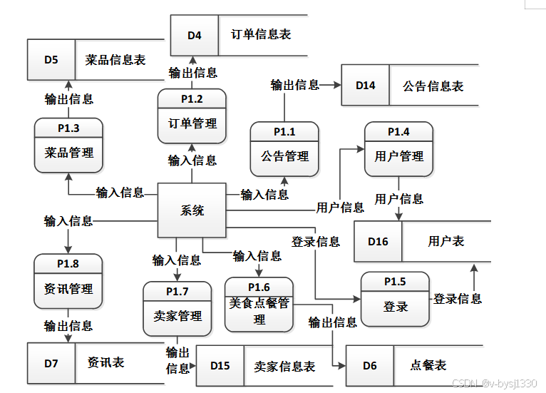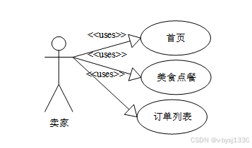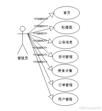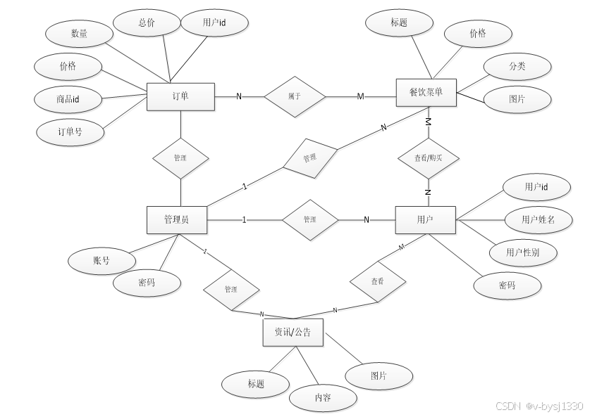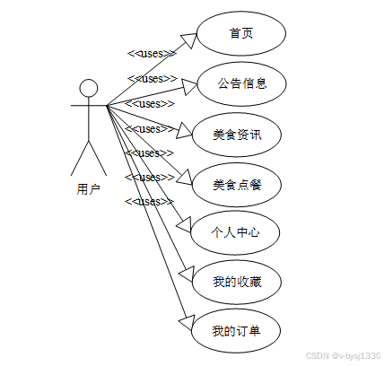 普通用户和美食存在点餐关系,关系为一对多,根据美食编号来将美食数据传入到点餐数据中,操作人为普通用户,然后生成点餐列表,普通用户查看个人历史点餐列表,可以进行数据销毁。