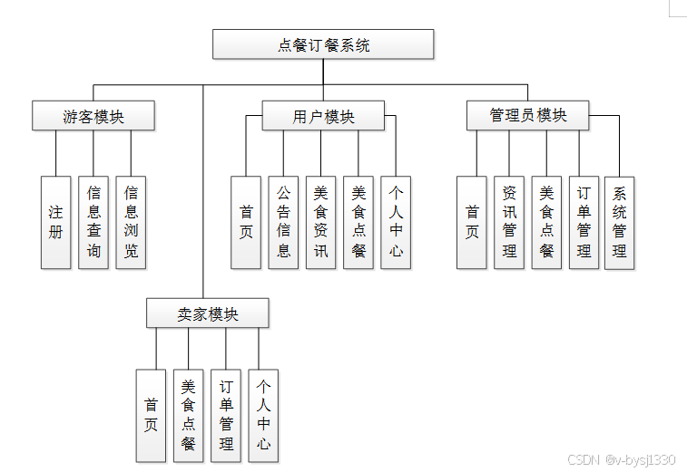 系统设计的目的是分析系统包括的所有功能结构,为开发人员设计开发和实现系统做好准备工作。经过前期的需求调查、分析和整理之后,确定的总体需求主要包括多个模块,分别是:首页、轮播图、公告信息、资源管理(美食资讯、资讯分类)商城管理(美食点餐、分类列表、订单列表)系统用户(管理员、普通用户、卖家)。系统整体角色分为三个部分,一是用户、二是卖家、最后是管理员。权限分布也是很明显,;普通用户是在除去浏览信息之外还具有查询和管理自己账户信息、美食点餐等权限;管理员是最高权限拥有者。
