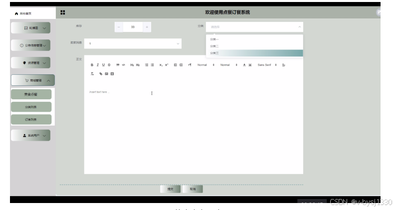本设计主要实现集人性化、高效率、便捷等优点于一身的点餐订餐系统,完成首页、轮播图、公告信息、资源管理(美食资讯、资讯分类)商城管理(美食点餐、分类列表、订单列表)系统用户(管理员、普通用户、卖家)等功能模块。系统通过浏览器与服务器进行通信,实现数据的交互与变更。只需通过一台电脑,动动手指就可以操作系统,实现数据通信管理。整个系统的设计过程都充分考虑了数据的安全、稳定及可靠等问题,而且操作过程简单。本系统通过科学的管理方式、便捷的服务提高了工作效率,减少了数据存储上的错误和遗漏。
