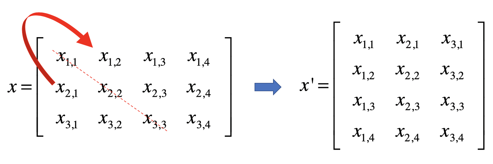 转置(Transposition)是指矩阵内的元素行索引和纵索引互换,例如X_ijX\_{ij}X_ij就变为X_jiX\_{ji}X_ji,相应的,矩阵的形状由转置前的n × m变为转置后的m × n。从几何的角度来说,矩阵的转置就是原矩阵以对角线为轴进行翻转后的结果。下面这张图展示了矩阵XXX转置之后的矩阵X’X’X’: