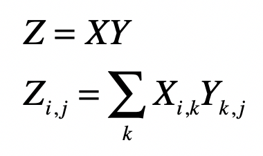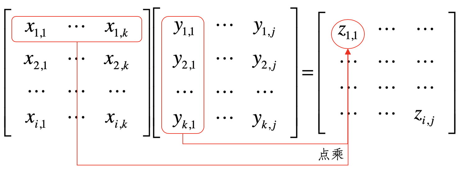 其中,矩阵ZZZ为矩阵XXX和YYY的乘积,XXX是形状为i x k的矩阵,而YYY是形状为k × j的矩阵。XXX的列数k必须和YYY的行数k相等,两者才可以进行这样的乘法。
