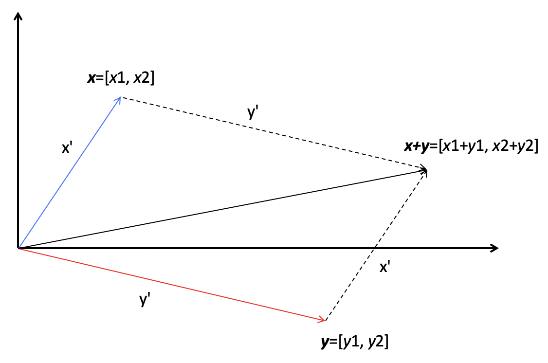 在这张图中,有两个向量x和y,它们的长度分别是x’和y’,它们的相加结果是x+y,这个结果所对应的点相当于x向量沿着y向量的方向移动y’,或者是y向量沿着x向量的方向移动x’。