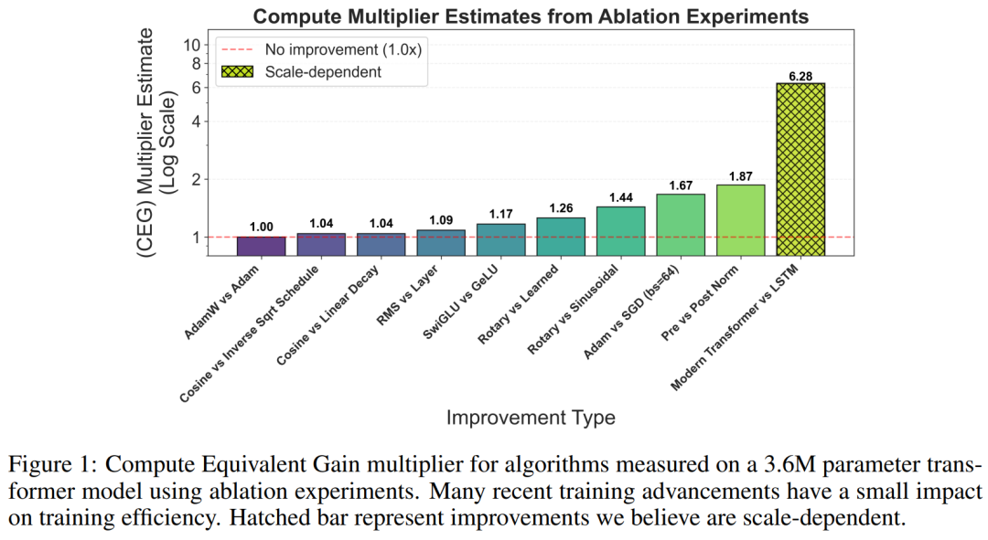 有趣的是,他们看到一个高度偏斜的效率提升分布:尽管所有被消融的创新带来的提升都低于 4×,但提升倍数却极不均匀,主要集中在少数几项改进上,例如 Adam 或 pre-layernorm。