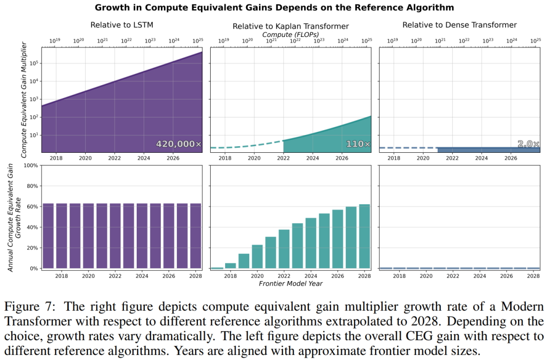 2:本文发现有两项强烈依赖规模(scale-dependent)的算法创新:从 LSTM 到 Transformer,以及从 Kaplan 到 Chinchilla 。当将其外推到 2025 年的计算前沿时,这两项创新合计占据了全部效率提升的 91%。这意味着:对于小规模模型而言,算法进步的幅度比此前认为的要小几个数量级。