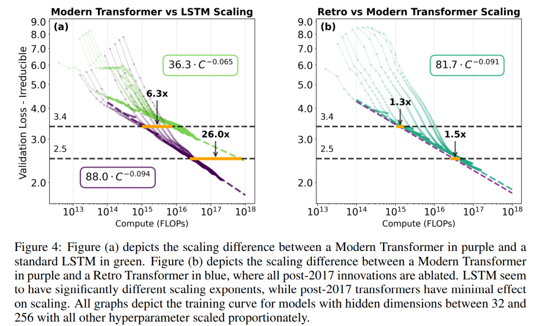 实验中发现,从 LSTM 切换到 Modern Transformer 的总效率提升为 6.28×,而从 LSTM 切换到 Retro Transformer 的效率提升为 4.69×。这比 Ho 等人(2024)的估计(他们认为 LSTM→Transformer 的提升约 60×)小得多。