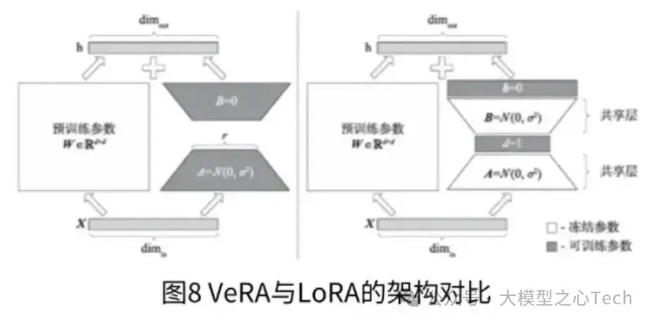 在VeRA中,这些矩阵被冻结,在所有层之间共享,并通过可训练向量和进行适应,从而显著减少可训练参数的数量。