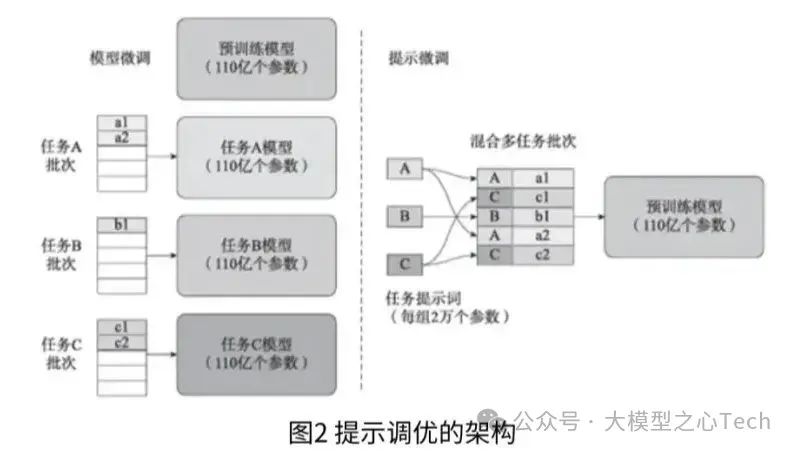 在论文的实验对比中,对于T5-XXL模型,每个经过调整的模型副本需要110亿个参数,相较于为每个下游任务制作特定的预训练模型副本,提示调优需要的参数规模仅为20480个参数。该方法在少样本提示方面表现出色。