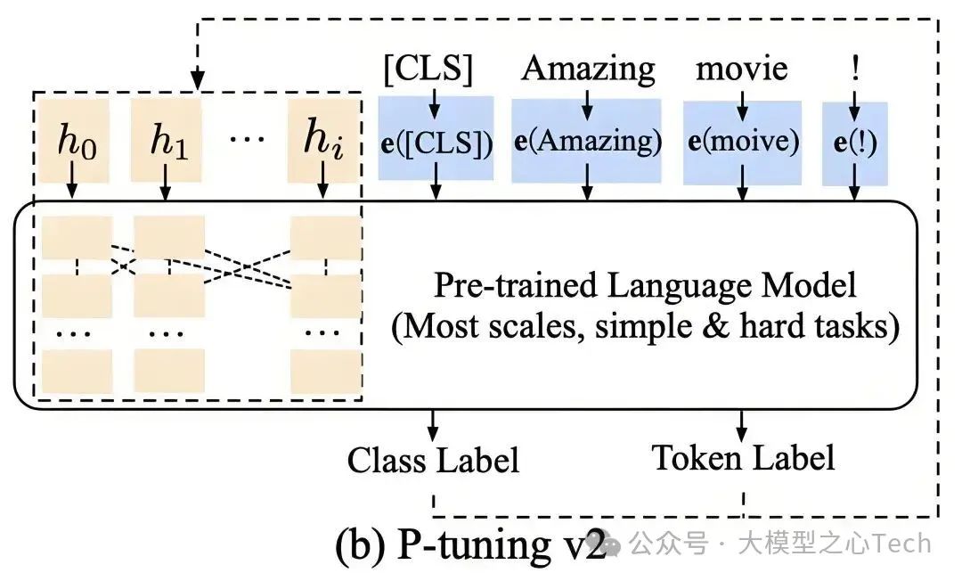 这实际上是一种针对大型语言模型的软提示方法,主要是将大型语言模型的词嵌入层和每个Transformer网络层前都加上新的参数。