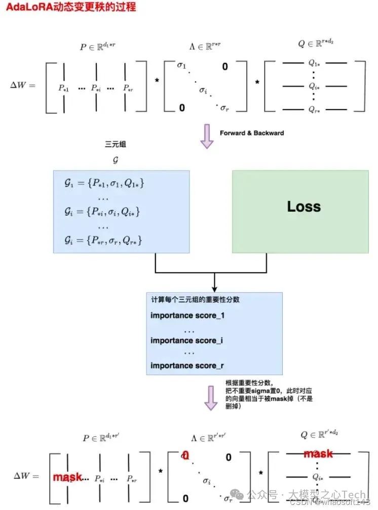在实际操作中,AdaLoRA采用奇异值分解(SVD)的方法来进行参数训练,根据重要性指标剪裁掉不重要的奇异值来提高计算效率,从而进一步提升模型在微调阶段的效果。