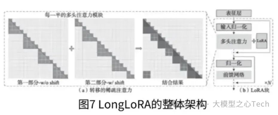为了在有限的计算成本下扩展预训练大型语言模型的上下文大小,研究者在论文“LongLoRA: Efficient Fine-tuningof Long-ContextLarge LanguageModels”中提出了LongLORA的方法,如图7所示