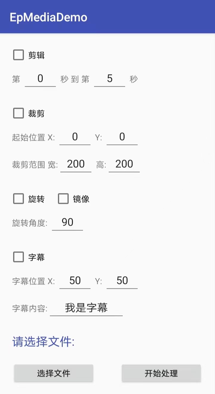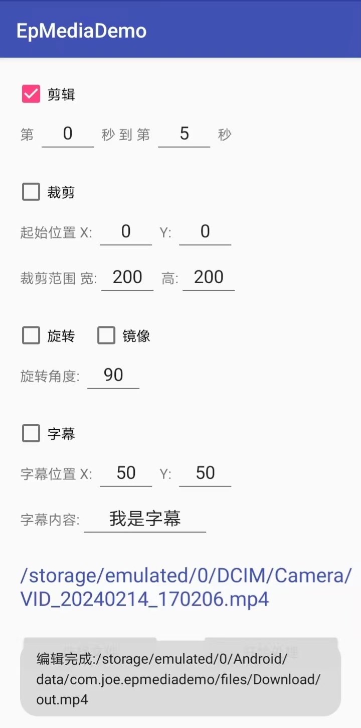那么通过Android Studio Dolphin编译EpMedia并安装到真机上,点击【处理单个视频】后进入单视频的编辑页面如下图所示: