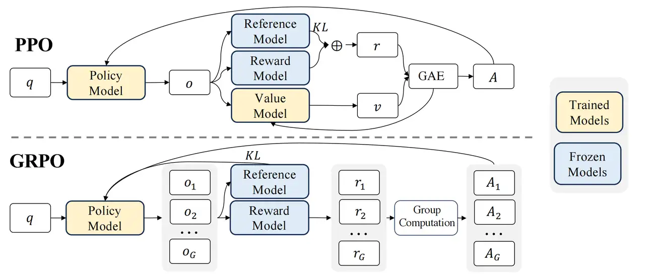 Group Relative Policy Optimization (GRPO) 是 Proximal Policy Optimization (PPO) 近端策略优化的变种 放弃了值模型和 critic 模型,从群奖励分数取计算Adventage,更新策略函数,大幅减少计算量