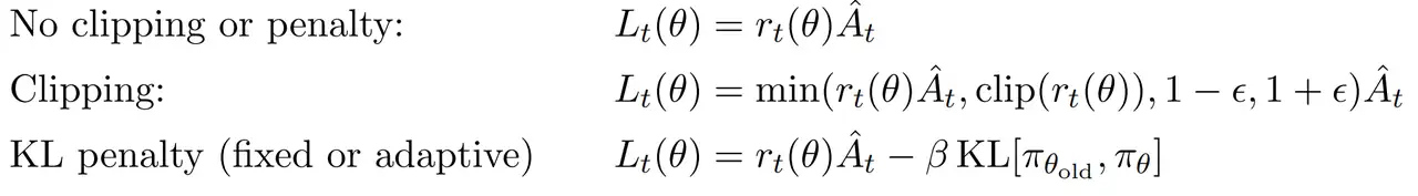 具体而言,PPO 使用了对 TRPO 优化的一阶近似,对最大化的目标函数做了 CLIP 裁剪的创新技巧 换言之,也就是对目标函数的悲观估计,可以每次少量优化,防止优化策略过大和训练不稳定,增加模型的鲁棒性 或者用 KL 散度惩罚项来替代 CLIP 裁剪,所以 PPO 分两种形式,PPO-Penality 和 PPO-Clip