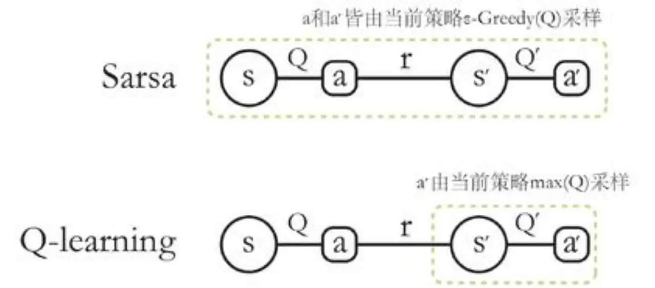 Q 学习在更新 Q 表格的时候所用到的 Q(s′,a′) 对应的动作不一定是下一步会执行的动作,因为下一步实际会执行的动作可能是因为进一步的探索而得到的 Q 学习默认的动作不是通过行为策略来选取的,它默认 a′ 为最佳策略对应的动作,所以 Q 学习算法在更新的时候,不需要传入 a′