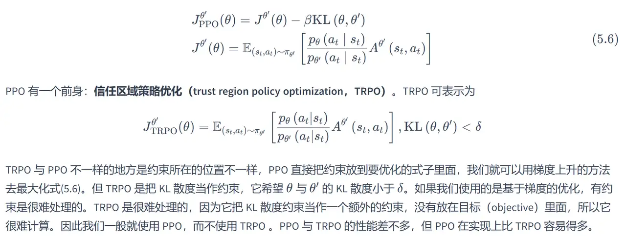 因为该算法比较复杂,使用了泰勒展开近似,共轭梯度,线性搜索等方法直接求解,计算过程十分复杂,运算量非常大,而且也被相对简单的 PPO 因计算量低且性能相当的优势所替代,在此就不做过多赘述