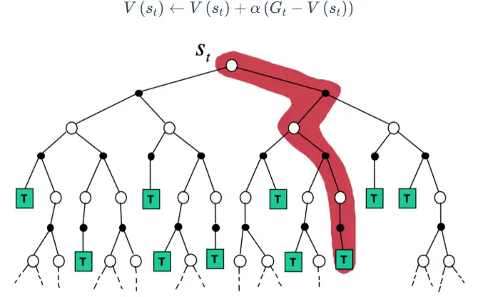 V(st)=V(st)+α(Gt−V(st))=V(st)=V(st)+α(rt+1+γ2rt+2+...+γT−t+2rT−V(st))