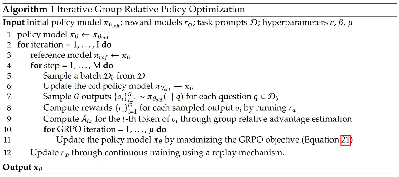 JGRPO(θ)=E[q∼P(Q),{oi}i=1G∼πθold(O|q)]1G∑i=1G1|oi|∑t=1|oi|πθ(oi,t|q,oi,<t)πθold(oi,t|q,oi,<t)A^i,t−βDKL[πθ||πref]=E[q∼P(Q),{oi}i=1G∼πθold(O|q)]1G∑i=1G1|oi|∑t=1|oi|πθ(oi,t|q,oi,<t)πθold(oi,t|q,oi,<t)A^i,t−β(π𝑟𝑒𝑓(𝑜𝑖,𝑡|𝑞,𝑜𝑖,<𝑡)πθ(𝑜𝑖,𝑡|𝑞,𝑜𝑖,<𝑡)−logπ𝑟𝑒𝑓(𝑜𝑖,𝑡|𝑞,𝑜𝑖,<𝑡)πθ(𝑜𝑖,𝑡|𝑞,𝑜𝑖,<𝑡)−1) )