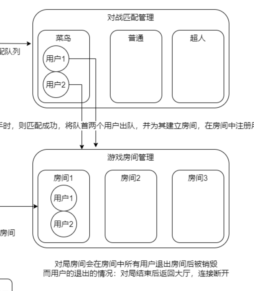 而实现玩家匹配的思想十分简单,为不同的档次设计各自的匹配队列,当一个队列中的玩家数量大于等于2的时候,则意味着同一档次中,有2个及以上的人要进行实战匹配,则出队队列中的前两个用户,相当于队首2个玩家匹配成功,这时候为其创建房间,并将两个用户信息加入房间中。