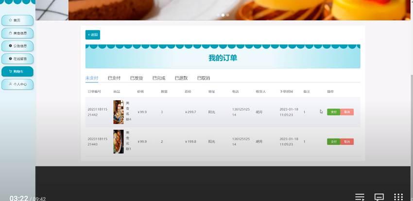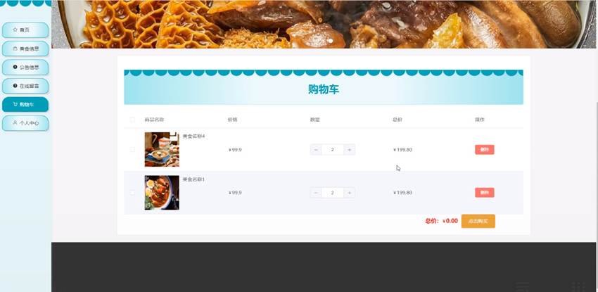 系统涵盖管理员、用户、配送员三大角色功能,核心模块包括系统首页、个人中心、用户管理、菜品分类管理、美食信息管理、配送员管理、配送订单管理、在线留言、系统管理、订单管理等。管理员统筹平台管理;用户可浏览菜品、在线订餐;配送员负责订单配送与进度更新。系统支持菜品分类检索、订单状态追踪、在线留言等功能,实现了校园外卖全流程的数字化与规范化。