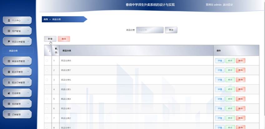 管理员点击菜品分类管理。在菜品分类页面输入菜品分类进行查询、新增或删除菜品分类列表,并根据需要对菜品分类详情信息进行详情、修改或删除操作;如图5-9所示: