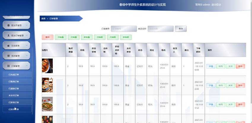 管理员点击订单管理。在已支付订单页面输入订单编号和商品名称对已支付订单列表进行查询,删除,日销量,月销量,年销量,日销额,月销额,年销售额操作,并根据需要对已支付订单详细信息需要进行详情,物流,发货或删除操作;还可以对未支付订单、已完成订单、已取消订单和已退款订单进行相对应操作,如图5-13所示: